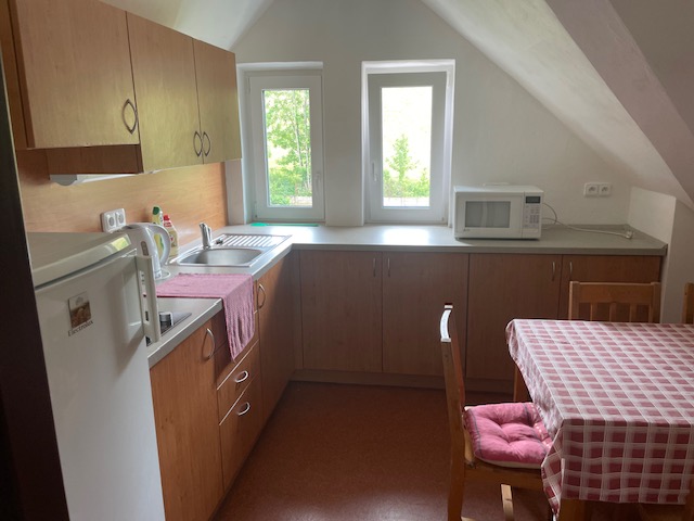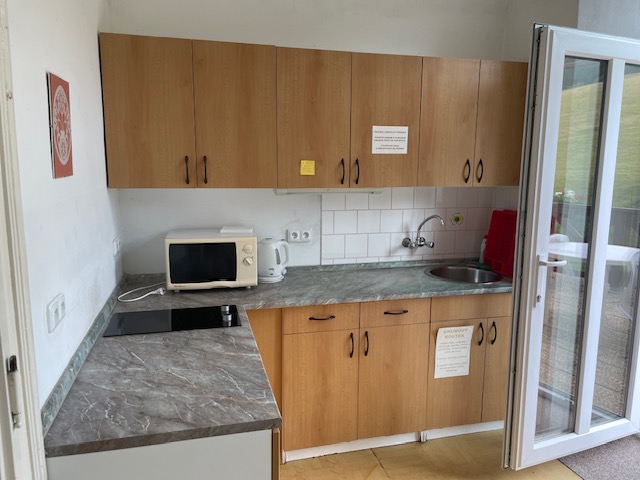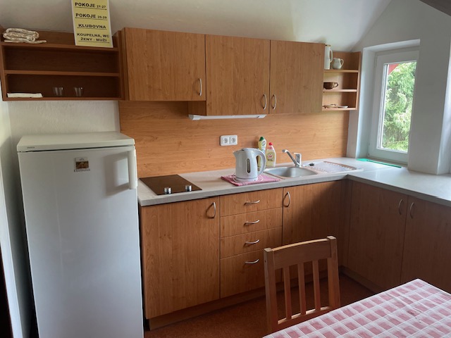Kuchyňky v1. a 2. patře nabízejí: vybavená kuchyňská linka, mikrovlná trouba, el.indukční varič, varná konvice lednice