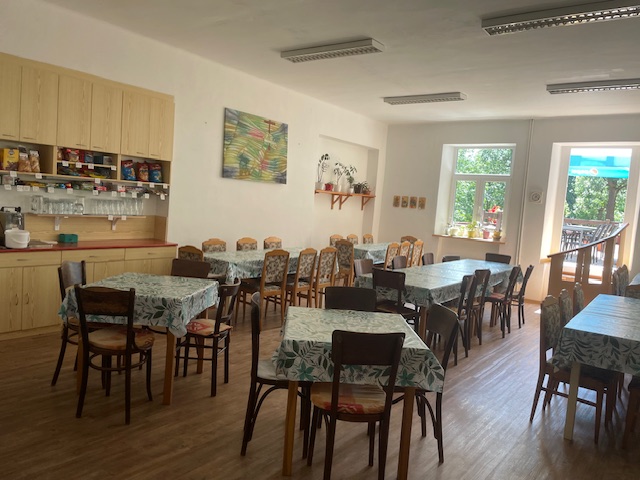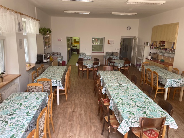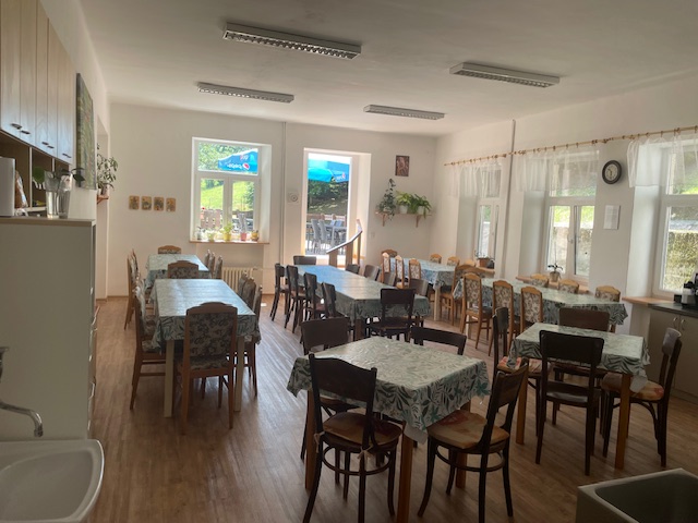 Jídelna v přízemí pro společné stolování a dvě kuchyňky pro hosty.